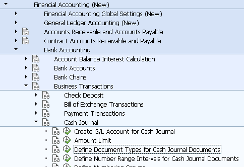 IMG Path: Financial Accounting (New) -> Bank Accounting (Business Transactions) -> Cash Journal -> Define Document Types for Cash Journal Documents
